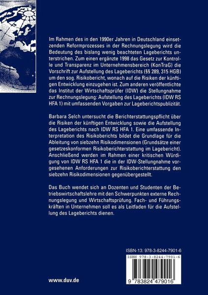 Barbara Selch untersucht die Berichterstattungspflicht über die Risiken der künftigen Entwicklung sowie die Aufstellung des Lageberichts nach IDW RS HFA 1. Eine umfassende Interpretation des Risikoberichts bildet die Grundlage für die Ableitung von siebzehn Risikodimensionen (Grundsätze einer gesetzeskonformen Risikoberichterstattung im Lagebericht). Anschließend werden im Rahmen einer kritischen Würdigung von IDW RS HFA 1 die in der IDW-Stellungnahme vorgesehenen Anforderungen zur Risikoberichterstattung den siebzehn Risikodimensionen gegenübergestellt.
