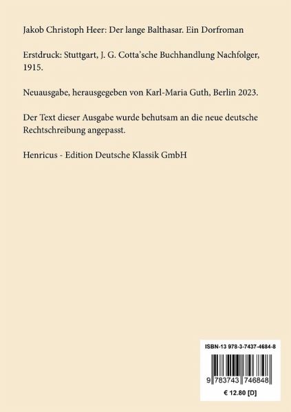 Jakob Christoph Heer: Der lange Balthasar. Ein DorfromanErstdruck: Stuttgart, J. G. Cotta'sche Buchhandlung Nachfolger, 1915.Neuausgabe, herausgegeben von Karl-Maria Guth, Berlin 2023.Der Text dieser Ausgabe wurde behutsam an die neue deutsche Rechtschreibung angepasst.Gesetzt aus der Minion Pro, 11 pt.Die Sammlung Hofenberg erscheint im Verlag Henricus - Edition Deutsche Klassik GmbH, Berlin