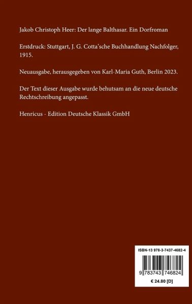 Jakob Christoph Heer: Der lange Balthasar. Ein DorfromanErstdruck: Stuttgart, J. G. Cotta'sche Buchhandlung Nachfolger, 1915.Neuausgabe, herausgegeben von Karl-Maria Guth, Berlin 2023.Der Text dieser Ausgabe wurde behutsam an die neue deutsche Rechtschreibung angepasst.Gesetzt aus der Minion Pro, 11 pt.Die Sammlung Hofenberg erscheint im Verlag Henricus - Edition Deutsche Klassik GmbH, Berlin