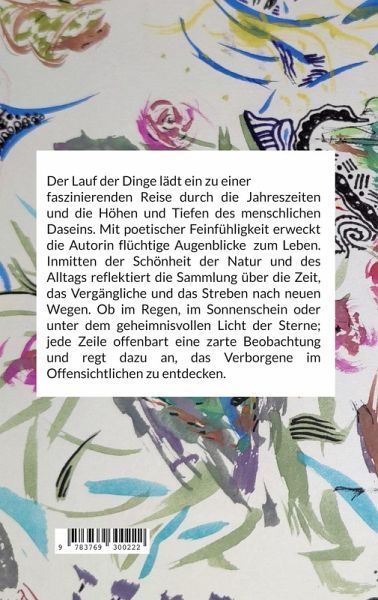 Der Lauf der Dinge lädt ein zu einer faszinierenden Reise durch die Jahreszeiten und die Höhen und Tiefen des menschlichen Daseins. Mit poetischer Feinfühligkeit erweckt die Autorin flüchtige Augenblicke zum Leben. Inmitten der Schönheit der Natur und des Alltags reflektiert die Sammlung über die Zeit, das Vergängliche und das Streben nach neuen Wegen. Ob im Regen, im Sonnenschein oder unter dem geheimnisvollen Licht der Sterne; jede Zeile offenbart eine zarte Beobachtung und regt dazu an, das Verborgene im Offensichtlichen zu entdecken.