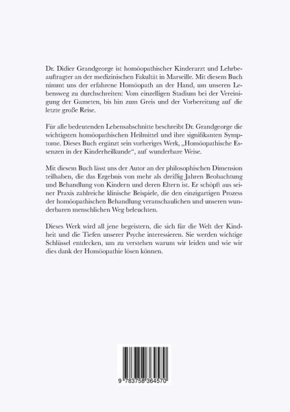 Mit diesem Buch nimmt uns der erfahrene Homöopath an der Hand, um unseren Lebensweg zu durchschreiten: Vom einzelligenStadium bei der Vereinigung der Gameten, bis hin zum Greis und der Vorbereitung auf die letzte große Reise.Für alle bedeutenden Lebensabschnitte beschreibt Dr. Grandgeorge die wichtigsten homöopathischen Heilmittel und ihre signifikanten Symptome. Dieses Werk ergänzt sein vorheriges Buch, Homöopathische Essenzen in der Kinderheilkunde, auf wunderbare Weise.Mit diesem Buch lässt uns der Autor an der philosophischen Dimension teilhaben, die das Ergebnis von mehr als dreißig Jahren Beobachtung und Behandlung von Kindernund deren Eltern ist. Er schöpft aus seiner Praxis zahlreiche klinische Beispiele, die den einzigartigen Prozess der homöopathischen Behandlung veranschaulichen und unserenwunderbaren menschlichen Weg beleuchten.Dieses Werk wird all jene begeistern, die sich für die Welt der Kindheit und die Tiefen unserer Psyche interessieren. Sie werden wichtige Schlüssel entdecken, um zu verstehen warum wir leiden und wie wir dies dank der Homöopathie lösen können.