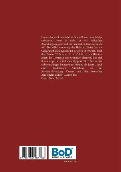Caesar, der wohl unbeliebteste Mann Roms, muss Erfolge aufweisen, wenn er nicht in der politischen Bedeutungslosigkeit und im finanziellen Ruin versinken will. Die Völkerwanderung der Helvetier, bietet ihm die Gelegenheit, ganz Gallien mit Krieg zu überziehen. Nach dem Motto: "Teile und Herrsche" hilft er den Häduern gegen die Germanen und verhindert dadurch, dass sich ihm ein geeintes Gallien entgegenstellt. Tiberius, ein siebzehnjähriger Bauernjunge nimmt, als Rekrut der ruhmreichen Legionen, an der Auseinandersetzung Caesars mit der römischen Aristokratie und den Galliern teil. Nach einer gnadenlosen Ausbildung überlebt er zuerst die Schlacht mit den Helvetiern, den Kampf mit den Germanen und lernt dann, durch die Druiden, den Zugang zu einer grausamen keltischen Götterwelt kennen, die einige Überraschungen für ihn bereithält.Cover: Dieter Eckert
