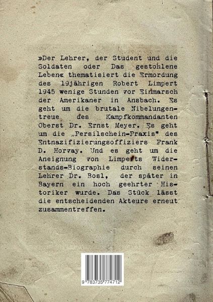 »Der Lehrer, der Student und die Soldaten oder Das gestohlene Leben« thematisiert die Ermordung des 19jährigen Robert Limpert 1945 wenige Stunden vor Einmarsch der Amerikaner in Ansbach. Es geht um die brutale Nibelungentreue des Kampfkommandanten Oberst Dr. Ernst Meyer. Es geht um die "Persilschein-Praxis" des Entnazifizierungsoffiziers Frank D. Horvay. Und es geht um die Aneignung von Limperts Widerstands-Biographie durch seinen Lehrer Dr. Bosl, der später in Bayern ein hoch geehrter Historiker wurde. Das Stück lässt die entscheidenden Akteure erneut zusammentreffen.