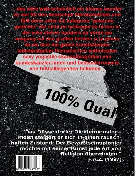 Über das Buch: Während der Vor- und Nachbereitungsphase der legendären Bücherei-Lesung "POESIEPANDEMIE - LYRIK LEBT WEITER!" (www.LyrikLebt.de) entstanden in einem einzigartigen Schaffensrausch derart viele extrem "ungesunde" lyrische Manifeste, dass es für 2023 nicht beim Gedichtband "SYMPTOMFREI OFFLINE" bleiben konnte. Seit 2014 erschienen bislang über 30 Publikationen im BoD-Verlag. Das vorliegende Buch zeugt von der gnadenlosen Ehrlichkeit einer brutalen Neuropoesie, die sich über weit mehr empört und für viel mehr engagiert als es sowohl dem klassischen Neurotiker als auch dem klimafizierten Demonstranten bewusst ist: Schockierende Wahrheiten, die im literarischen Underground kursieren und die normalen Bestseller als Mängelexemplare enttarnen! Alles 100% Erstveröffentlichungen, u.a. vom satirischen "PAMPHLET ZUR RETTUNG DER KULTURÄMTER" und dem Nobelpreis-kritischen Langgedicht "GLASFASERLYRIK", für das De Toys eigentlich den Nobelpreis verdient hätte! Beide Texte wurden vom Autor bereits für seine YouTube-Playlist eingesprochen, siehe www.Lyrikperformance.de / TEXTBEISPIEL: ...das wäre wahrscheinlich ein kleines wunder zu viel für den deutschen literaturbetrieb und fällt dann unter die kategorie "gesunde gedichte" die nicht im lyrikregal da hinten in der ecke stehen sondern da vorne am ausgang auf den großen tischen ja ja genau da wo sich die geilen kunstkalender lebensratgeber thematischen anthologien sexy yogastile skandalbiografien von bundeskanzler:innen und bestsellerromane von fußballlegenden befinden... aus: "SPRACHFETISCHISMUS" (De Toys, 24.+30.4.2023)
