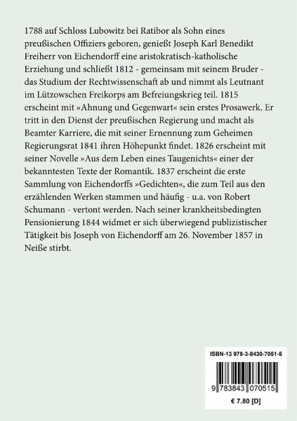 Joseph von Eichendorff: Der letzte Held von Marienburg. Trauerspiel Erstdruck: Königsberg (Hartung), 1830. Uraufführung am 27.2.1831 zur Eröffnung des Landtages, Stadttheater, Königsberg. Vollständige Neuausgabe mit einer Biographie des Autors. Herausgegeben von Karl-Maria Guth. Berlin 2015. Textgrundlage ist die Ausgabe: Joseph von Eichendorff: Werke. Nach den Ausgaben letzter Hand unter Hinzuziehung der Erstdrucke herausgegeben von Ansgar Hillach, Bd. 1¿3, München: Winkler, 1970 ff. Die Paginierung obiger Ausgabe wird in dieser Neuausgabe als Marginalie zeilengenau mitgeführt. Umschlaggestaltung von Thomas Schultz-Overhage unter Verwendung des Bildes: Jan Matejko, Schlacht bei Grundwald, 1878. Gesetzt aus Minion Pro, 11 pt. Über den Autor: 1788 auf Schloss Lubowitz bei Ratibor als Sohn eines preußischen Offiziers geboren, genießt Joseph Karl Benedikt Freiherr von Eichendorff eine aristokratisch-katholische Erziehung und schließt 1812 - gemeinsam mit seinem Bruder - das Studium der Rechtwissenschaft ab und nimmt als Leutnant im Lützowschen Freikorps am Befreiungskrieg teil. 1815 erscheint mit »Ahnung und Gegenwart« sein erstes Prosawerk. Er tritt in den Dienst der preußischen Regierung und macht als Beamter Karriere, die mit seiner Ernennung zum Geheimen Regierungsrat 1841 ihren Höhepunkt findet. 1826 erscheint mit seiner Novelle »Aus dem Leben eines Taugenichts« einer der bekanntesten Texte der Romantik. 1837 erscheint die erste Sammlung von Eichendorffs »Gedichten«, die zum Teil aus den erzählenden Werken stammen und häufig - u.a. von Robert Schumann - vertont werden. Nach seiner krankheitsbedingten Pensionierung 1844 widmet er sich überwiegend publizistischer Tätigkeit bis Joseph von Eichendorff am 26. November 1857 in Neiße stirbt.