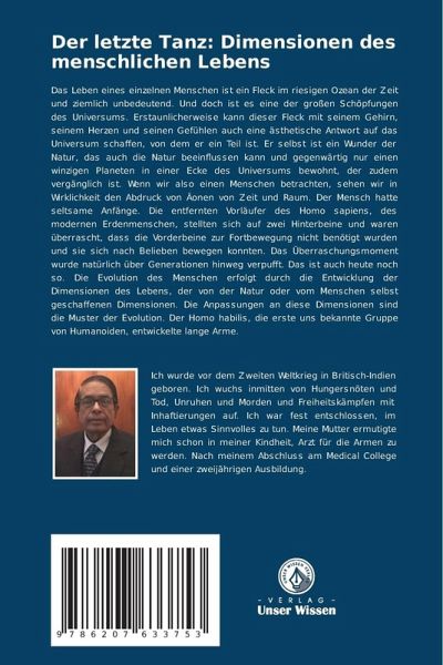 Das Leben eines einzelnen Menschen ist ein Fleck im riesigen Ozean der Zeit und ziemlich unbedeutend. Und doch ist es eine der großen Schöpfungen des Universums. Erstaunlicherweise kann dieser Fleck mit seinem Gehirn, seinem Herzen und seinen Gefühlen auch eine ästhetische Antwort auf das Universum schaffen, von dem er ein Teil ist. Er selbst ist ein Wunder der Natur, das auch die Natur beeinflussen kann und gegenwärtig nur einen winzigen Planeten in einer Ecke des Universums bewohnt, der zudem vergänglich ist. Wenn wir also einen Menschen betrachten, sehen wir in Wirklichkeit den Abdruck von Äonen von Zeit und Raum. Der Mensch hatte seltsame Anfänge. Die entfernten Vorläufer des Homo sapiens, des modernen Erdenmenschen, stellten sich auf zwei Hinterbeine und waren überrascht, dass die Vorderbeine zur Fortbewegung nicht benötigt wurden und sie sich nach Belieben bewegen konnten. Das Überraschungsmoment wurde natürlich über Generationen hinweg verpufft. Das ist auch heute noch so.Die Evolution des Menschen erfolgt durch die Entwicklung der Dimensionen des Lebens, der von der Natur oder vom Menschen selbst geschaffenen Dimensionen. Die Anpassungen an diese Dimensionen sind die Muster der Evolution. Der Homo habilis, die erste uns bekannte Gruppe von Humanoiden, entwickelte lange Arme.