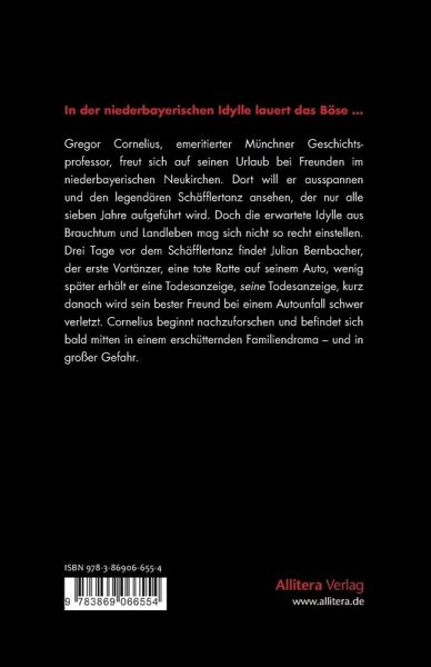 Gregor Cornelius, emeritierter Münchner Geschichtsprofessor, freut sich auf seinen Urlaub bei Freunden im niederbayerischen Neukirchen. Dort will er ausspannen und den legendären Schäfflertanz ansehen, der nur alle sieben Jahre aufgeführt wird. Doch die erwartete Idylle aus Brauchtum und Landleben mag sich nicht so recht einstellen. Drei Tage vor dem Schäfflertanz findet Julian Bernbacher, der erste Vortänzer, eine tote Ratte auf seinem Auto, wenig später erhält er eine Todesanzeige, seine Todesanzeige, kurz danach wird sein bester Freund bei einem Autounfall schwer verletzt. Cornelius beginnt nachzuforschen und befindet sich bald mitten in einem erschütternden Familiendrama ¿ und in großer Gefahr.