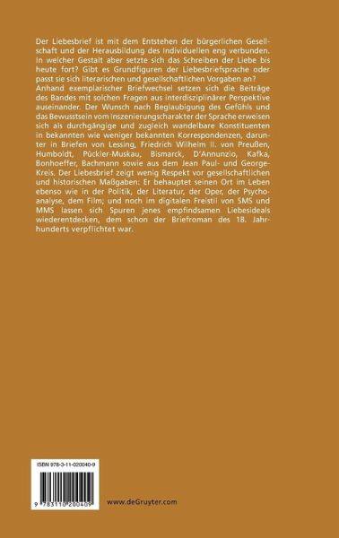 In welcher Gestalt aber wurde die Erfindung des bürgerlichen Liebesbriefs im 18. Jahrhundert bis in die Gegenwart mit ihren medialen Brüchen fortgeschrieben? Gibt es eine Invarianz der Liebessprache in Briefen, oder sind sie Teil der allgemeinen Entwicklung der Schriftkultur? Im vorliegenden Band eines Braunschweiger Forschungsprojekts zur Liebesbriefkultur sind Beiträge versammelt, die sich diesen bisher kaum erforschten Fragen stellen. Experten aus Literaturwissenschaft, Theologie und Wissenschaftsgeschichte stellen autor- und problemorientierte Zugänge vor: von Lessing und Eva König zu Ingeborg Bachmann und Hans Werner Henze, vom englischen Briefroman des 18. Jahrhunderts zu SMS und MMS. Die Ergebnisse überraschen: Offenkundig hat die Sprache der Gefühle ein freieres Spiel im Kultursystem als dies bisher angenommen wurde. Der Liebesbrief entwirft als Dokument alltäglicher kultureller Praxis ein Schrift- und Zeitregime eigener Ordnung und ist als Phänomen sui generis zu betrachten: Es gibt eine spezifische Liebesbriefkultur, die ihre Eigenart zwischen vorgegebenen Diskursangeboten und privatsprachlicher Intimität entfaltet und behauptet. Der vorliegende Band legt einen wichtigen Grundstein zu ihrer Erforschung.