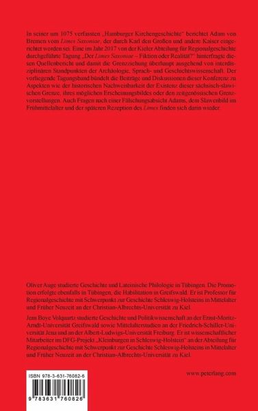 In seiner um 1075 verfassten «Hamburger Kirchengeschichte» berichtet Adam von Bremen vom «Limes Saxoniae», der durch Karl den Großen und andere Kaiser eingerichtet worden sei. Eine im Jahr 2017 von der Kieler Abteilung für Regionalgeschichte durchgeführte Tagung «Der 'Limes Saxoniae' - Fiktion oder Realität?» hinterfragte diesen Quellenbericht und damit die Grenzziehung überhaupt ausgehend von interdisziplinären Standpunkten der Archäologie, Sprach- und Geschichtswissenschaft. Der vorliegende Tagungsband bündelt die Beiträge und Diskussionen dieser Konferenz zu Aspekten wie der historischen Nachweisbarkeit der Existenz dieser sächsisch-slawischen Grenze, ihres möglichen Erscheinungsbildes oder den zeitgenössischen Grenzvorstellungen. Auch Fragen nach einer Fälschungsabsicht Adams, dem Slawenbild im Frühmittelalter und der späteren Rezeption des «Limes» finden sich darin wieder.