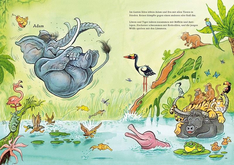Welche Tiere können für welche Menschen in den Bibelerzählungen stehen? Adam und Evasind ein Elefantenpaar: Schließlich sind Elefanten großartige Gärtner für den Paradiesgarten.Noah muss ein eifriger Biber sein. Wer könnte besser mit dem Holz für die Arche umgehen?Wenn der Pharao von Ägypten ein gefährliches Krokodil ist, muss Mose ein starkes Nilpferd sein.Nur ein Nilpferd kann sich mit einem Krokodil messen. Und Jesus? Jesus ist der Löwe von Juda.
