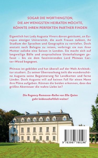 Sogar die Worthington, die am wenigsten heiraten möchte, könnte ihren perfekten Partner finden … Die romantische Regency-Reihe von Ella Quinn geht leidenschaftlich weiter! Eigentlich hat Lady Augusta Vivers davon geträumt, an Europas einziger Universität, die auch Frauen zulässt, ihr Studium der Sprachen und Geographie zu vertiefen. Doch anstatt nach Bologna zu reisen, verbringt sie nun ihrer Mutter zuliebe eine Saison in London. Sie macht sich auf langweilige Bälle und anspruchslose Unterhaltungen gefasst – bis sie dem faszinierenden Lord Phineas Carter-Wood begegnet. Phineas ist gebildet und hat überall auf der Welt Architektur studiert. Zu seiner Überraschung teilt die wunderschöne Augusta seine Begeisterung für Landkarten und ferne Länder. Doch Augusta will auf keinen Fall für einen Mann ihre Pläne aufgeben. Können die beiden erkennen, dass das größte Abenteuer die wahre Liebe ist? Alle Bände der The Worthingtons können unabhängig voneinander gelesen werden. Erste Leser:innenstimmen „Diesmal wird man nicht nur in die Regency Zeit, sondern auch auf Reisen entführt … mein bisher liebster Teil der Reihe!" „Wunderschöner historischer Roman – zum wegträumen und verlieben." „Ella Quinns humorvollen wie fesselnden Schreibstil muss man einfach lieben." „Augusta und Phineas habe ich sofort ins Herz geschlossen, was für eine Lovestory!"