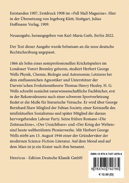 H. G. Wells: Der Luftkrieg. Ein fantastischer RomanEntstanden 1907, Erstdruck 1908 im »Pall Mall Magazine«. Hier in der Übersetzung von Ingeborg Klett, Stuttgart, Julius Hoffmann Verlag, 1909.Neuausgabe, herausgegeben von Karl-Maria Guth, Berlin 2023.Der Text dieser Ausgabe wurde behutsam an die neue deutsche Rechtschreibung angepasst.Umschlagabbildung: Illustration von Joseph Pennell für ein Plakat mit dem Aufruf »That liberty shall not perish from the earth - Buy liberty bonds Fourth Liberty Loan« von 1918Gesetzt aus der Minion Pro, 11 pt.Die Sammlung Hofenberg erscheint im Verlag Henricus - Edition Deutsche Klassik GmbH, BerlinÜber den Autor:1866 als Sohn eines semiprofessionellen Kricketspielers im Londoner Vorort Bromley geboren, studiert Herbert George Wells Physik, Chemie, Biologie und Astronomie; Letzteres bei dem einflussreichen Agnostiker und Unterstützer der Darwin'schen Evolutionstheorie Thomas Henry Huxley. H. G. Wells schreibt zunächst naturwissenschaftliche Fachbücher, erst in der Rekonvaleszenz nach einer schweren Sportverletzung findet er die Muße für literarische Versuche. Er wird über George Bernhard Shaw Mitglied der Fabian Society, einer Keimzelle des intellektuellen Sozialismus und später Mitglied der daraus hervorgehenden Labour Party. Seine frühen Romane »Die Zeitmaschine«, »Der Unsichtbare« und »Der Krieg der Welten« sind heute weltberühmte Pionierwerke. Mit Herbert George Wells stirbt am 13. August 1946 einer der Gründerväter der modernen Science-Fiction-Literatur. Auf dem Mond und auf dem Mars ist je ein Krater nach ihm benannt.