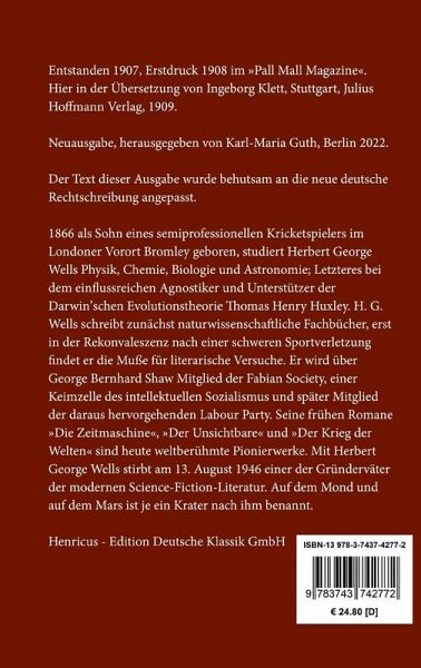 H. G. Wells: Der Luftkrieg. Ein fantastischer RomanEntstanden 1907, Erstdruck 1908 im »Pall Mall Magazine«. Hier in der Übersetzung von Ingeborg Klett, Stuttgart, Julius Hoffmann Verlag, 1909.Neuausgabe, herausgegeben von Karl-Maria Guth, Berlin 2023.Der Text dieser Ausgabe wurde behutsam an die neue deutsche Rechtschreibung angepasst.Umschlagabbildung: Illustration von Joseph Pennell für ein Plakat mit dem Aufruf »That liberty shall not perish from the earth - Buy liberty bonds Fourth Liberty Loan« von 1918Gesetzt aus der Minion Pro, 11 pt.Die Sammlung Hofenberg erscheint im Verlag Henricus - Edition Deutsche Klassik GmbH, BerlinÜber den Autor:1866 als Sohn eines semiprofessionellen Kricketspielers im Londoner Vorort Bromley geboren, studiert Herbert George Wells Physik, Chemie, Biologie und Astronomie; Letzteres bei dem einflussreichen Agnostiker und Unterstützer der Darwin'schen Evolutionstheorie Thomas Henry Huxley. H. G. Wells schreibt zunächst naturwissenschaftliche Fachbücher, erst in der Rekonvaleszenz nach einer schweren Sportverletzung findet er die Muße für literarische Versuche. Er wird über George Bernhard Shaw Mitglied der Fabian Society, einer Keimzelle des intellektuellen Sozialismus und später Mitglied der daraus hervorgehenden Labour Party. Seine frühen Romane »Die Zeitmaschine«, »Der Unsichtbare« und »Der Krieg der Welten« sind heute weltberühmte Pionierwerke. Mit Herbert George Wells stirbt am 13. August 1946 einer der Gründerväter der modernen Science-Fiction-Literatur. Auf dem Mond und auf dem Mars ist je ein Krater nach ihm benannt.