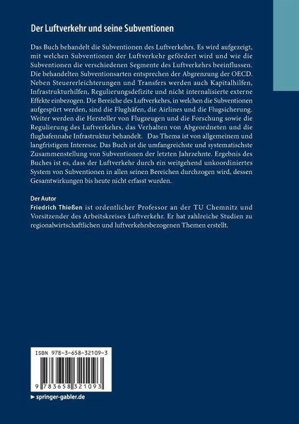Das Buch behandelt die Subventionen des Luftverkehrs. Es wird aufgezeigt, mit welchen Subventionen der Luftverkehr gefördert wird und wie die Subventionen die verschiedenen Segmente des Luftverkehrs beeinflussen. Die behandelten Subventionsarten entsprechen der Abgrenzung der OECD. Neben Steuererleichterungen und Transfers werden auch Kapitalhilfen, Infrastrukturhilfen, Regulierungsdefizite und nicht internalisierte externe Effekte einbezogen. Die Bereiche des Luftverkehrs, in welchen die Subventionen aufgespürt werden, sind die Flughäfen, die Airlines und die Flugsicherung. Weiter werden die Hersteller von Flugzeugen und die Forschung sowie die Regulierung des Luftverkehrs, das Verhalten von Abgeordneten und die flughafennahe Infrastruktur behandelt. Das Thema ist von allgemeinem und langfristigem Interesse. Das Buch ist die umfangreichste und systematischste Zusammenstellung von Subventionen der letzten Jahrzehnte. Ergebnis des Buches ist es, dass der Luftverkehr durch ein weitgehend unkoordiniertes System von Subventionen in allen seinen Bereichen durchzogen wird, dessen Gesamtwirkungen bis heute nicht erfasst wurden.