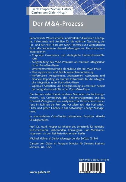 Renommierte Wissenschaftler und Praktiker diskutieren Konzepte, Instrumente und Ansätze für die optimale Gestaltung der Pre- und der Post-Phase des M&A-Prozesses und verdeutlichen damit die besonderen Herausforderungen von Unternehmensintegrationen: - Corporate Governance und strategische Unternehmensführung- Ausgestaltung des M&A-Prozesses als zentraler Erfolgsfaktor in der Pre-M&A-Phase- Unternehmensbewertung als Nukleus der Pre-M&A-Phase- Planungsprozess- und Berichtswesenharmonisierung- Performance Measurement, Management Accounting und Financial Reporting als zentrale Instrumente für die erfolgreiche Integration in der Post-M&A-Phase- Optimale Allokation und Erfolgsmessung als zentraler Aspekt der Integrationskontrolle in der Post-M&A-PhaseDie Autoren stellen hierfür moderne Methoden des Rechnungswesens, des Controllings, des Risikomanagements und des Financial Management vor, analysieren die Unternehmenssteuerung im Rahmen der Pre- und vor allem auch der Post-M&A-Phase und geben Einblick in das notwendige Change Management.
