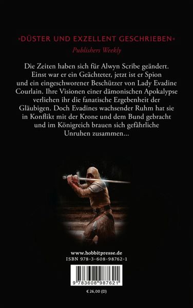 Die Zeiten haben sich für Alwyn Scribe geändert. Einst war er ein Geächteter, jetzt ist er Spion und ein eingeschworener Beschützer von Lady Evadine Courlain. Ihre Visionen einer dämonischen Apokalypse verliehen ihr die fanatische Ergebenheit der Gläubigen. Doch Evadines wachsender Ruhm hat sie in Konflikt mit der Krone und dem Bund gebracht und im Königreich brauen sich gefährliche Unruhen zusammen...