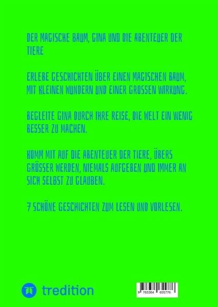 Der magische Baum, Gina und die Abenteuer der TiereErlebe Geschichten über einen magischen Baum, mit kleinen Wundern und einer großen Wirkung.Begleite Gina durch ihre Reise, die Welt ein wenig besser zu machen.Komm mit auf die Abenteuer der Tiere, übers größer werden, niemals aufgeben und immer an sich selbst zu glauben.7 schöne Geschichten zum Lesen und Vorlesen.Für Leseanfänger geeignet.