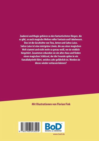 Zauberei und Magie gehören zu den fantastischsten Dingen, die es gibt, so auch magische Welten voller Fantasie und Fabelwesen. Dies ist die Geschichte von Tina, Anton und Sahra-Luise. Sahra-Luise ist eine mintgrüne Löwin, die aus einer magischen Welt stammt und nicht mehr so genau weiß, wo sie wirklich hingehört. Zusammen erkunden sie ein altes Haus und finden einen magischen Schlüssel, der die Freunde später in ein Kanallabyrinth führt, welches sehr gefährlich ist. Werden sie dieses wieder verlassen können?