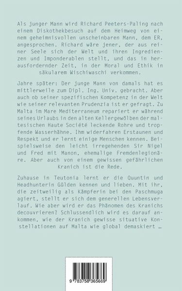 Als junger Mann wird Richard Peeters-Paling auf dem Nachhauseweg von einer Diskothek von einem geheimnisvollen unscheinbaren Mann, dem ER, angesprochen. Richard wäre jener, der aus reiner Seele sich der Welt und ihren Ingredienzen und Imponderablen stellt, und das in herausfordernder Zeit, in der Moral und Ethik in säkularem Wischiwaschi verkommen. Jahre später: Der junge Mann von damals hat es mittlerweile zum Dipl. Ing. Univ. gebracht. Aber auch ob seiner spezifischen Kompetenz in der Welt wie seiner relevanten Prudenzia ist er gefragt. Zu Malta im Mare Mediterraneum repariert er während seines Urlaubs in den alten Kellergewölben der honorigen maltesischen Haute Société leckende Rohre und tropfende Wasserhähne. Ihm widerfahren Erstaunen wie Respekt und er lernt einige Menschen kennen. Beispielsweise den leicht irregehenden Sir Nigel und Fred mit Manon, ehemalige Fremdlegionäre. Aber auch von einem gewissen gefährlichen Kranich ist die Rede.Zuhause in Teutonia lernt er die Quuntin und Headhunterin Gülden kennen und lieben. Mit ihr, die zeitweilig als Kämpferin bei den Paschmuga agiert, stellt er sich dem generellen Lebensverlauf. Wie aber wird er das Phänomen des Kranichs decouvrieren? Schlussendlich wird es darauf ankommen, wie der Kranich gewisse situative Konstellationen auf Malta wie global demaskiert ...