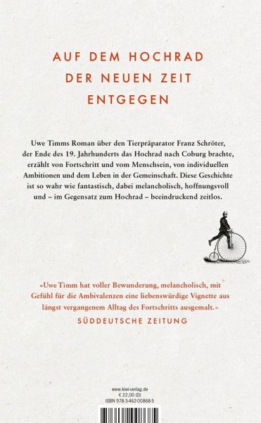 Uwe Timms Roman über den Tierpräparator Franz Schröter, der Ende des 19. Jahrhunderts das Hochrad nach Coburg brachte, erzählt von Fortschritt und vom Menschsein, von individuellen Ambitionen und dem Leben in der Gemeinschaft. Diese Legende ist so wahr wie fantastisch, dabei melancholisch, hoffnungsvoll und - im Gegensatz zum Hochrad - beeindruckend zeitlos.