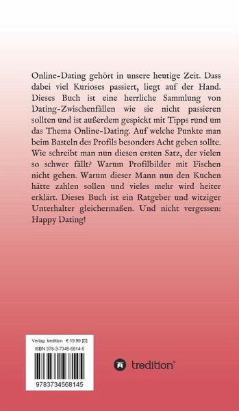 Online-Dating gehört in unsere heutige Zeit. Dass dabei viel Kurioses passiert, liegt auf der Hand. Dieses Buch ist eine herrliche Sammlung von Dating-Zwischenfällen wie sie nicht passieren sollten und ist außerdem gespickt mit Tipps rund um das Thema Online-Dating. Auf welche Punkte man beim Basteln des Profils besonders Acht geben sollte. Wie schreibt man nun diesen ersten Satz, der vielen so schwer fällt? Warum Profilbilder mit Fischen nicht gehen. Warum dieser Mann nun den Kuchen hätte zahlen sollen und vieles mehr wird heiter erklärt. Dieses Buch ist ein Ratgeber und witziger Unterhalter gleichermaßen. Und nicht vergessen: Happy Dating!