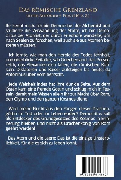 Das römische Grenzland unter Antoninus Pius (140 u. Z.):Ihr kennt mich. Ich bin Democritus der Alchemist und studierte die Verwandlung der Stoffe, ich bin Democritus der Atomist, der durch Friedhöfe wandelte, um nach Seelen zu forschen, weil auch sie aus Atomen bestehen müssen.Ich lernte, wie man den Herold des Todes fernhält, und überblicke Zeitalter, sah Griechenland, das Perserreich, das Alexanderreich fallen, die römischen Konsuln, Diktatoren und Kaiser aufsteigen bis heute, da Antoninus über Rom herrscht.Jede Weisheit indes hat ihre dunkle Seite. Aus dem Osten kam eine fremde Göttin und schlug mich in Fesseln, damit mein Wissen allein ihr zur Macht über Rom, den Olymp und den ganzen Kosmos diene.Wird meine Flucht aus den Fängen dieser Drachengöttin im Tod oder im Leben enden? Democritus soll als Entdecker des Grundgesetzes des Kosmos in Erinnerung bleiben und nicht als Drachenkönig von Rom geehrt werden!Das Atom und die Leere: Das ist die einzige Unsterblichkeit, für die es sich zu leben lohnt.