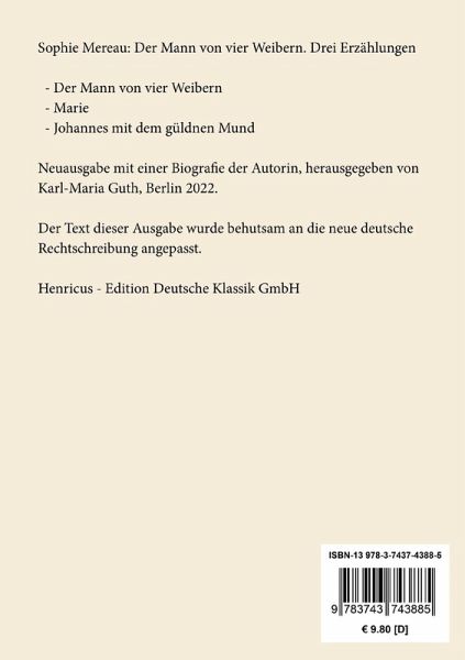 Sophie Mereau: Der Mann von vier Weibern. Drei ErzählungenDer Mann von vier Weibern: Erstdruck in: Bunte Reihe kleiner Schriften von Sophie Brentano, Frankfurt a. M., Wilmans, 1805.Marie: Erstdruck in: »Flora. Teutschlands Töchtern geweiht von Freunden und Freundinnen des schönen Geschlechts«, Drittes Bändchen, Tübingen, 1798. Auch in: »Allgemeines europäisches Journal«, Neunter Band, Brünn, Verlag von Joseph Georg Traßler, 1798.Johannes mit dem güldnen Mund: Erstdruck in: Bunte Reihe kleiner Schriften von Sophie Brentano, Frankfurt a. M., Wilmans, 1805.Inhaltsverzeichnis:Der Mann von vier Weibern.Marie.Johannes mit dem güldnen Mund.Biografie.Neuausgabe mit einer Biografie der Autorin, herausgegeben von Karl-Maria Guth, Berlin 2023.Der Text dieser Ausgabe wurde behutsam an die neue deutsche Rechtschreibung angepasst.Umschlagabbildung: Sophie Friederike Mereau (Zeichnung, um 1798)Gesetzt aus der Minion Pro, 11 pt.Die Sammlung Hofenberg erscheint im Verlag Henricus - Edition Deutsche Klassik GmbH, Berlin