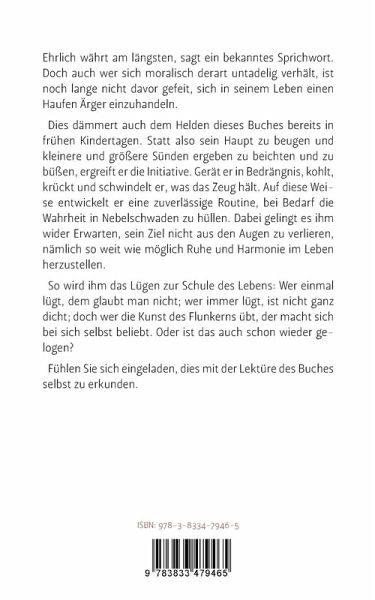 Ehrlich währt am längsten, sagt ein bekanntes Sprichwort. Doch auch wer sich moralisch derart untadelig verhält, ist noch lange nicht davor gefeit, sich in seinem Leben einen Haufen Ärger einzuhandeln.Dies dämmert auch dem Helden dieses Buches bereits in frühen Kindertagen. Statt also sein Haupt zu beugen und kleinere und größere Sünden ergeben zu beichten und zu büßen, ergreift er die Initiative. Gerät er in Bedrängnis, kohlt, krückt und schwindelt er, was das Zeug hält. Auf diese Weise entwickelt er eine zuverlässige Routine, bei Bedarf die Wahrheit in Nebelschwaden zu hüllen. Dabei gelingt es ihm wider Erwarten, sein Ziel nicht aus den Augen zu verlieren, nämlich so weit wie möglich Ruhe und Harmonie im Leben herzustellen. So wird ihm das Lügen zur Schule des Lebens: Wer einmal lügt, dem glaubt man nicht; wer immer lügt, ist nicht ganz dicht; doch wer die Kunst des Flunkerns übt, der macht sich bei sich selbst beliebt. Oder ist das auch schon wieder gelogen?Fühlen Sie sich eingeladen, dies mit der Lektüre des Buches selbst zu erkunden.