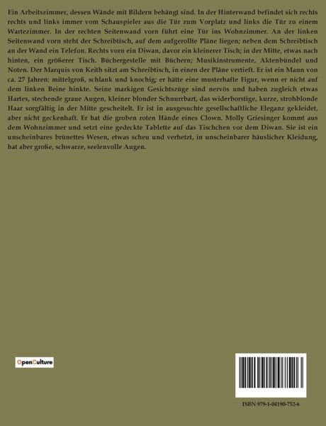 Ein Arbeitszimmer, dessen Wände mit Bildern behängt sind. In der Hinterwand befindet sich rechts rechts und links immer vom Schauspieler aus die Tür zum Vorplatz und links die Tür zu einem Wartezimmer. In der rechten Seitenwand vorn führt eine Tür ins Wohnzimmer. An der linken Seitenwand vorn steht der Schreibtisch, auf dem aufgerollte Pläne liegen; neben dem Schreibtisch an der Wand ein Telefon. Rechts vorn ein Diwan, davor ein kleinerer Tisch; in der Mitte, etwas nach hinten, ein größerer Tisch. Büchergestelle mit Büchern; Musikinstrumente, Aktenbündel und Noten. Der Marquis von Keith sitzt am Schreibtisch, in einen der Pläne vertieft. Er ist ein Mann von ca. 27 Jahren: mittelgroß, schlank und knochig; er hätte eine musterhafte Figur, wenn er nicht auf dem linken Beine hinkte. Seine markigen Gesichtszüge sind nervös und haben zugleich etwas Hartes, stechende graue Augen, kleiner blonder Schnurrbart, das widerborstige, kurze, strohblonde Haar sorgfältig in der Mitte gescheitelt. Er ist in ausgesuchte gesellschaftliche Eleganz gekleidet, aber nicht geckenhaft. Er hat die groben roten Hände eines Clown. Molly Griesinger kommt aus dem Wohnzimmer und setzt eine gedeckte Tablette auf das Tischchen vor dem Diwan. Sie ist ein unscheinbares brünettes Wesen, etwas scheu und verhetzt, in unscheinbarer häuslicher Kleidung, hat aber große, schwarze, seelenvolle Augen.