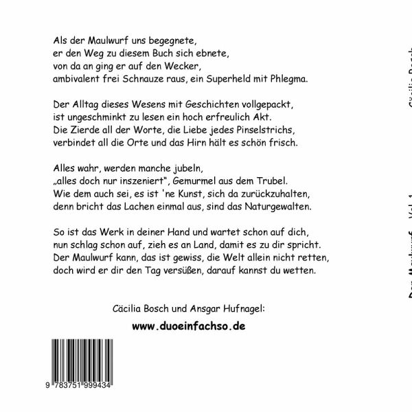 Als der Maulwurf uns begegnete, er den Weg zu diesem Buch sich ebnete, von da an ging er auf den Wecker, ambivalent frei Schnauze raus, ein Superheld mit Phlegma.Der Alltag dieses Wesens mit Geschichten vollgepackt, ist ungeschminkt zu lesen ein hoch erfreulich Akt. Die Zierde all der Worte, die Liebe jedes Pinselstrichs verbindet all die Orte und das Hirn hält es schön frisch.