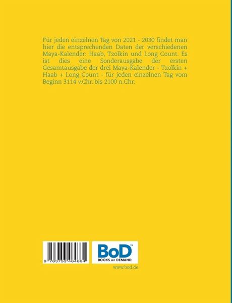 Für jeden einzelnen Tag von 2021 - 2030 findet man hier die entsprechenden Daten der verschiedenen Maya-Kalender: Haab, Tzolkin und Long Count. Es ist dies eine Sonderausgabe der ersten Gesamtausgabe der drei Maya-Kalender - Tzolkin + Haab + Long Count - für jeden einzelnen Tag vom Beginn 3114 v.Chr. bis 2100 n.Chr.