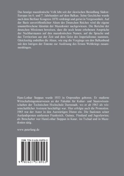 Das heutige mazedonische Volk lebt seit der slawischen Besiedlung Südost-Europas im 6. und 7. Jahrhundert auf dem Balkan. Seine Geschichte wurde nach dem Berliner Kongress 1878 verdrängt und geriet in Vergessenheit. Auf der Basis unveröffentlichter Akten des Deutschen Reiches wird die eigene ununterbrochene Identität der Mazedonier nachgewiesen. Die Berichte der deutschen Missionen beweisen, dass die noch heute erhobenen Ansprüche der Nachbarstaaten auf den mazedonischen Namen, auf die Sprache und das Territorium aus der Zeit und dem Geist des Imperialismus stammen. Gleichzeitig enthüllen die Akten, wie eng die Vorgänge um den Balkanbund mit den Intrigen der Entente zur Auslösung des Ersten Weltkriegs zusammenhingen.