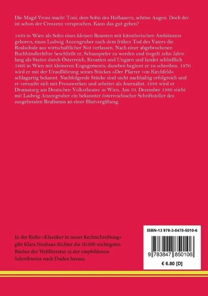 In der Reihe »Klassiker in neuer Rechtschreibung« gibt Klara Neuhaus-Richter die wichtigsten Bücher der Weltliteratur in der empfohlenen Schreibweise nach Duden heraus. Ludwig Anzengruber: Der Meineidbauer. Volksstück mit Gesang in drei Akten Die Magd Vroni macht Toni, dem Sohn des Hofbauern, schöne Augen. Doch der ist schon der Creszenz versprochen. Kann das gut gehen? Erstdruck: Wien (Rosner), 1871. Uraufführung am 9.12.1871, Theater an der Wien, Wien. Textgrundlage ist die Ausgabe: Ludwig Anzengruber: Der Meineidbauer. Herausgegeben und eingeleitet von Wilhelm Zentner, Stuttgart: Reclam, 1959 [Universal-Bibliothek, Band 133]. Die Paginierung obiger Ausgabe wird in dieser Neuausgabe als Marginalie zeilengenau mitgeführt. Neu herausgegeben und mit einer Biografie des Autors versehen von Klara Neuhaus-Richter, Berlin 2021. Umschlaggestaltung von Rainer Richter unter Verwendung einer Porträtzeichnung von Josefine Weinschrott. Gesetzt aus der Minion Pro, 11 pt. Henricus - Edition Deutsche Klassik GmbH Über den Autor: 1839 in Wien als Sohn eines kleinen Beamten mit künstlerischen Ambitionen geboren, muss Ludwig Anzengruber nach dem frühen Tod des Vaters die Realschule aus wirtschaftlicher Not verlassen. Nach einer abgebrochenen Buchhändlerlehre beschließt er, Schauspieler zu werden und tingelt zehn Jahre lang als Statist durch Österreich, Kroatien und Ungarn und landet schließlich 1866 in Wien mit kleineren Engagements; daneben beginnt er zu schreiben. 1870 wird er mit der Uraufführung seines Stückes »Der Pfarrer von Kirchfeld« schlagartig bekannt. Nachfolgende Stücke sind nicht nachhaltig erfolgreich und er versucht sich mit Prosawerken und arbeitet als Journalist. 1888 wird er Dramaturg am Deutschen Volkstheater in Wien. Am 10. Dezember 1889 stirbt mit Ludwig Anzengruber ein bekannter österreichischer Schriftsteller des ausgehenden Realismus an einer Blutvergiftung.