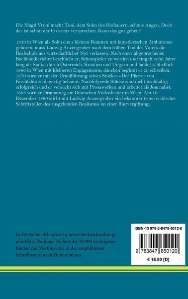 In der Reihe »Klassiker in neuer Rechtschreibung« gibt Klara Neuhaus-Richter die wichtigsten Bücher der Weltliteratur in der empfohlenen Schreibweise nach Duden heraus. Ludwig Anzengruber: Der Meineidbauer. Volksstück mit Gesang in drei Akten Die Magd Vroni macht Toni, dem Sohn des Hofbauern, schöne Augen. Doch der ist schon der Creszenz versprochen. Kann das gut gehen? Erstdruck: Wien (Rosner), 1871. Uraufführung am 9.12.1871, Theater an der Wien, Wien. Textgrundlage ist die Ausgabe: Ludwig Anzengruber: Der Meineidbauer. Herausgegeben und eingeleitet von Wilhelm Zentner, Stuttgart: Reclam, 1959 [Universal-Bibliothek, Band 133]. Die Paginierung obiger Ausgabe wird in dieser Neuausgabe als Marginalie zeilengenau mitgeführt. Neu herausgegeben und mit einer Biografie des Autors versehen von Klara Neuhaus-Richter, Berlin 2021. Umschlaggestaltung von Rainer Richter unter Verwendung einer Porträtzeichnung von Josefine Weinschrott. Gesetzt aus der Minion Pro, 11 pt. Henricus - Edition Deutsche Klassik GmbH Über den Autor: 1839 in Wien als Sohn eines kleinen Beamten mit künstlerischen Ambitionen geboren, muss Ludwig Anzengruber nach dem frühen Tod des Vaters die Realschule aus wirtschaftlicher Not verlassen. Nach einer abgebrochenen Buchhändlerlehre beschließt er, Schauspieler zu werden und tingelt zehn Jahre lang als Statist durch Österreich, Kroatien und Ungarn und landet schließlich 1866 in Wien mit kleineren Engagements; daneben beginnt er zu schreiben. 1870 wird er mit der Uraufführung seines Stückes »Der Pfarrer von Kirchfeld« schlagartig bekannt. Nachfolgende Stücke sind nicht nachhaltig erfolgreich und er versucht sich mit Prosawerken und arbeitet als Journalist. 1888 wird er Dramaturg am Deutschen Volkstheater in Wien. Am 10. Dezember 1889 stirbt mit Ludwig Anzengruber ein bekannter österreichischer Schriftsteller des ausgehenden Realismus an einer Blutvergiftung.
