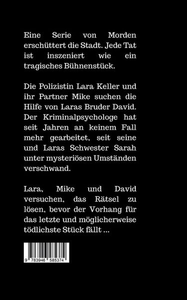 Eine Serie von Morden erschüttert die Stadt. Jede Tat ist inszeniert wie ein tragisches Bühnenstück. Die Polizistin Lara Keller und ihr Partner Mike suchen die Hilfe von Laras Bruder David. Der Kriminalpsychologe hat seit Jahren an keinem Fall mehr gearbeitet, seit seine und Laras Schwester Sarah unter mysteriösen Umständen verschwand.Lara, Mike und David versuchen, das Rätsel zu lösen, bevor der Vorhang für das letzte und möglicherweise tödlichste Stück fällt ...