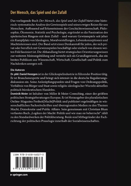 Dr. phil. Daniel Henzgen ist in der Glücksspielindustrie in führender Position tätig. Er ist Branchenexperte und bringt sich intensiv in die deutsche Regulierungsdiskussion ein. Seine Anknüpfungspunkte sind Fragen von Ordnungspolitik, Verhältnis von Bürger und Staat sowie religiös-ideologischer Wurzeln aktuellen politisch bürokratischen Handelns. Dominik Meier ist Inhaber von Miller & Meier Consulting, einer der größten politischen Strategieberatungen Europas. Er ist Herausgeber des pluralistischen Online-Magazins Freiheit Macht Politik und publiziert regelmäßigen in wissenschaftlichen Fachzeitschriften und überregionalen Medien zu den Themen Macht, Demokratie und Public Affairs. Sein gemeinsam mit Christian Blum verfasstes Buch "Logiken der Macht: Politik und wie man sie beherrscht" zählt zu den Standardwerken der Politikberatung. Beide sind Mitbegründer der Fachrichtung der politischen Praxelogie innerhalb der Sozialwissenschaften.