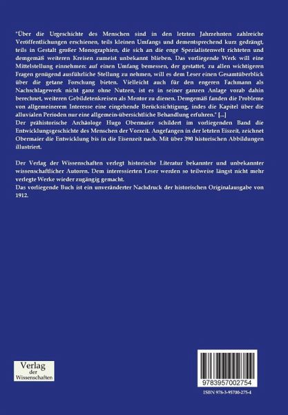 Der prähistorische Archäologe Hugo Obermaier schildert im vorliegenden Band die Entwicklungsgeschichte des Menschen der Vorzeit. Angefangen in der letzten Eiszeit, zeichnet Obermaier die Entwicklung bis in die Eisenzeit nach. Mit über 390 historischen Abbildungen illustriert.