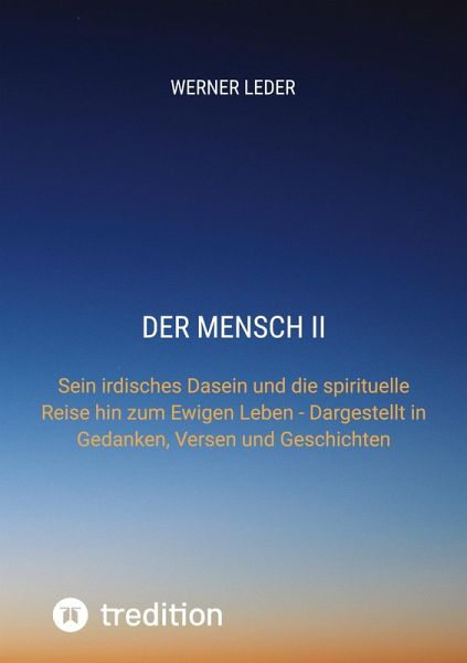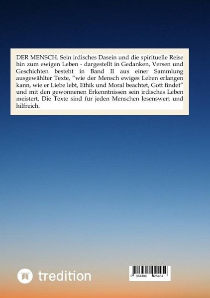 DER MENSCH. Sein irdisches Dasein und die spirituelle Reise hin zum ewigen Leben. Dargestellt in Gedanken, Versen und Geschichten ist die zweite Ausgabe von zwei Teilen und besteht in Band II aus einer Sammlung ausgewählter Texte wie der Mensch ewiges Leben erlangen kann, wie er Liebe lebt, Ethik und Moral beachtet, Gott findet und mit den gewonnenen Erkenntnissen sein irdisches Leben meistert. Die Texte sind für jeden Menschen lesenswert und hilfreich.