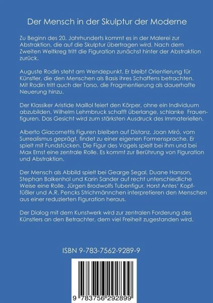 Der Mensch in der Skulptur der ModerneZu Beginn des 20. Jahrhunderts kommt es in der Malerei zur Abstraktion, die auf die Skulptur übetragen wird. Nach dem Zweiten Weltkrieg tritt die Figuration zunächst hinter der Abstraktion zurück. Auguste Rodin steht am Wendepunkt. Er bleibt Orientierung für Künstler, die den Menschen als Ausgangspunkt ihres Schaffens betrachten. Mit Rodin tritt auch der Torso, die Fragmentierung als dauerhafte Neuerung hinzu.Der Klassiker Aristide Maillol feiert den Körper, ohne ein Individuum abzubilden. Wilhelm Lehmbruck schafft überlange, schlanke Frauenfiguren. Das Gesicht wird zum stärksten Ausdruck des Immateriellen.Alberto Giacomettis Figuren bleiben auf Distanz. Joan Miró, vom Surrealismus geprägt, findet zu einer eigenen Formensprache. Er spielt mit Fundstücken. Die Figur des Vogels spielt bei ihm und bei Max Ernst eine zentrale Rolle. Es kommt zur Berührung von Figuration und Abstraktion.Der Mensch als Abbild spielt bei George Segal, Duane Hanson, Stephan Balkenhol und Karin Sander auf recht unterschiedliche Weise eine Rolle. Jügen Brodwolfs Tubenfigur, Horst Antes' Kopffüßler und A.R. Pencks Strichmännchen interpretieren den Menschen aus einer reduzierten Figuration heraus. Der Dialog mit demKunstwerk wird zur zentralen Forderung des Künstlers an den Betrachter, dem viel Freiheit zugestanden wird.