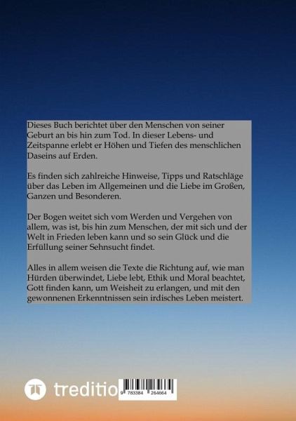 Dieses Buch berichtet über den Menschen von seiner Geburt an bis hin zum Tod. In dieser Lebens- und Zeitspanne erlebt er Höhen und Tiefen des menschlichen Daseins auf Erden.Es finden sich zahlreiche Hinweise, Tipps und Ratschläge über das Leben im Allgemeinen und die Liebe im Großen, Ganzen und Besonderen. Der Bogen weitet sich vom Werden und Vergehen von allem, was ist, bis hin zum Menschen, der mit sich und der Welt in Frieden leben kann und so sein Glück und die Erfüllung seiner Sehnsucht findet. Alles in allem weisen die Texte die Richtung auf, wie man Hürden überwindet, Liebe lebt, Ethik und Moral beachtet, Gott finden kann, um Weisheit zu erlangen, und mit den gewonnenen Erkenntnissen sein irdisches Leben zu meistern.