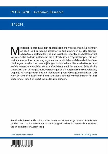 Minderjährige sind aus dem Sport nicht mehr wegzudenken. Sie nehmen an Welt- und Europameisterschaften teil, gewinnen bei den Olympischen Spielen Medaillen und sind in nahezu jeder Mannschaftssportart vertreten. Die Autorin untersucht die zivilrechtlichen Fragestellungen, die sich im Rahmen der Sportausübung ergeben, und stellt dabei auf die rechtlichen Verbindungen zwischen den minderjährigen Individual- und Mannschaftssportlern auf der einen Seite und den Vereinen/Verbänden auf der anderen Seite ab. Sie untersucht den Vertragsschluss, Verstöße gegen das Jugendarbeitsschutzgesetz, Doping, Haftungsfragen und die Beendigung von Vertragsverhältnissen. Der Kern der Arbeit besteht darin, die Schutzbelange des Minderjährigen mit der Chancengleichheit im Sport in Einklang zu bringen.