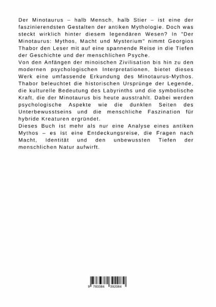 Der Minotaurus - halb Mensch, halb Stier - ist eine der faszinierendsten Gestalten der antiken Mythologie. Doch was steckt wirklich hinter diesem legendären Wesen? In "Der Minotaurus: Mythos, Macht und Mysterium" nimmt Georgios Thabor den Leser mit auf eine spannende Reise in die Tiefen der Geschichte und der menschlichen Psyche.Von den Anfängen der minoischen Zivilisation bis hin zu den modernen psychologischen Interpretationen, bietet dieses Werk eine umfassende Erkundung des Minotaurus-Mythos. Thabor beleuchtet die historischen Ursprünge der Legende, die kulturelle Bedeutung des Labyrinths und die symbolische Kraft, die der Minotaurus bis heute ausstrahlt. Dabei werden psychologische Aspekte wie die dunklen Seiten des Unterbewusstseins und die menschliche Faszination für hybride Kreaturen ergründet.Dieses Buch ist mehr als nur eine Analyse eines antiken Mythos - es ist eine Entdeckungsreise, die Fragen nach Macht, Identität und den unbewussten Tiefen der menschlichen Natur aufwirft.