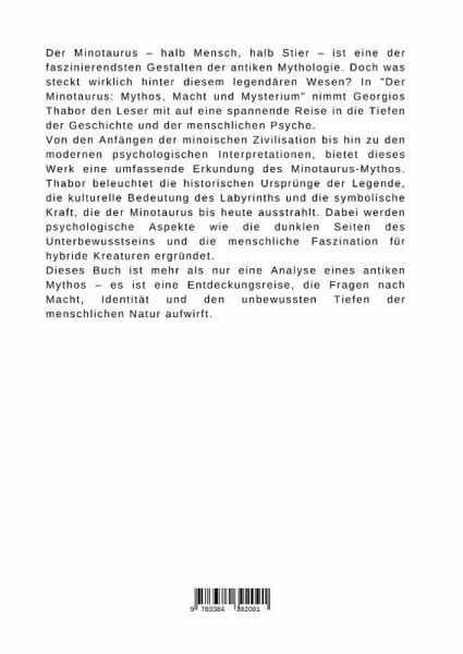 Der Minotaurus - halb Mensch, halb Stier - ist eine der faszinierendsten Gestalten der antiken Mythologie. Doch was steckt wirklich hinter diesem legendären Wesen? In "Der Minotaurus: Mythos, Macht und Mysterium" nimmt Georgios Thabor den Leser mit auf eine spannende Reise in die Tiefen der Geschichte und der menschlichen Psyche.Von den Anfängen der minoischen Zivilisation bis hin zu den modernen psychologischen Interpretationen, bietet dieses Werk eine umfassende Erkundung des Minotaurus-Mythos. Thabor beleuchtet die historischen Ursprünge der Legende, die kulturelle Bedeutung des Labyrinths und die symbolische Kraft, die der Minotaurus bis heute ausstrahlt. Dabei werden psychologische Aspekte wie die dunklen Seiten des Unterbewusstseins und die menschliche Faszination für hybride Kreaturen ergründet.Dieses Buch ist mehr als nur eine Analyse eines antiken Mythos - es ist eine Entdeckungsreise, die Fragen nach Macht, Identität und den unbewussten Tiefen der menschlichen Natur aufwirft.