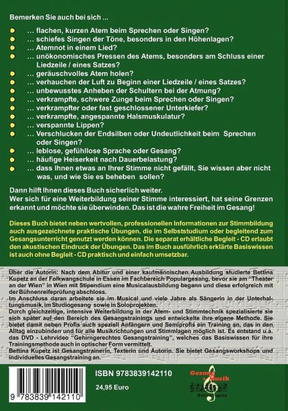 Singen Sie "fürs Leben gern", bekommen aber bei aller Gutwilligkeit nur leicht schräge Töne heraus? Oder singen Sie viel, werden dabei aber immer schnell heiser?"Wer sich für eine Weiterbildung seiner Stimme interessiert, hat seine Grenzen erkannt und möchte sie überwinden. Das ist die wahre Freiheit im Gesang", meint die ausgebildete Musical-Darstellerin und Gesangslehrerin Bettina Kupetz. In diesem Buch bietet sie neben wertvollen professionellen Informationen zur Stimmbildung auch ausgezeichnete praktische Übungen und Übungspläne, die im Selbststudium oder begleitend zum Gesangsunterricht genutzt werden können. Hilfreich für Anfänger wie für Profis, um aus seiner Stimme das Optimale hervorzuholen.Hier erfahren Sie alles, was man über Gesangstheorie und -praxis wissen muss.