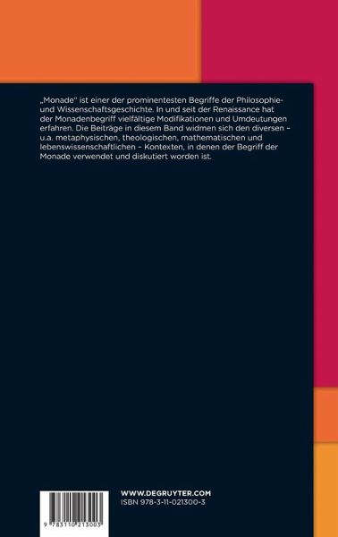 Gegenstand des Bandes ist einer der prominentesten Begriffe und Konzepte der Philosophie- und Wissenschaftsgeschichte. Die Herkunft des Monadenbegriffs aus pythagoreischen, hermetischen und neuplatonischen Kontexten wird von der Renaissance bis in die Aufklärung immer wieder von neuem und in diversen Debattenzusammenhängen reflektiert. Dabei erfährt das Monadenkonzept vielfältige Modifikationen und Umdeutungen. So hat der Begriff im 17. und 18. Jahrhundert sowohl metaphysische, universalwissenschaftliche, theologische als auch mathematische, physikalische und lebenswissenschaftliche Implikationen. Als wichtigste Scharnierstelle zwischen Spätrenaissance und Frühaufklärung fungiert seine Genese bei Leibniz. In den 1740er und 1750er Jahren schließlich erreicht der Monadenbegriff mit der Diskussion um die naturwissenschaftliche Anwendbarkeit der Leibniz-Wolffschen Monadenlehre anlässlich der Preisfrage der Königlich-Preußischen Akademie der Wissenschaften zu Berlin eine breite Öffentlichkeit und einen der markantesten Höhepunkte und Einschnitte in der Theoriegeschichte.