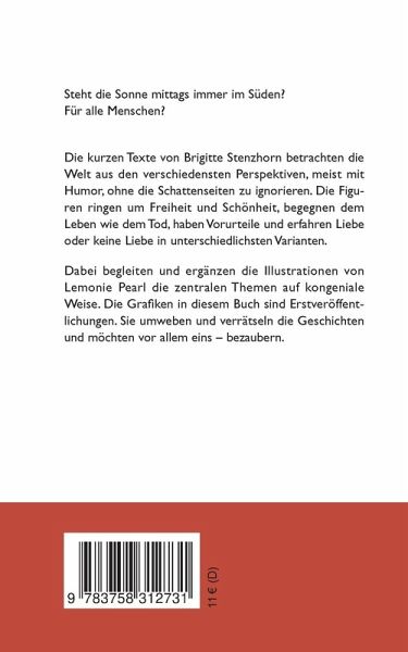 Steht die Sonne mittags immer im Süden? Für alle Menschen? Die kurzen Texte von Brigitte Stenzhorn betrachten die Welt aus den verschiedensten Perspektiven, meist mit Humor, ohne die Schattenseiten zu ignorieren. Die Figuren ringen um Freiheit, Schönheit, begegnen dem Leben wie dem Tod, haben Vorurteile und erfahren Liebe oder keine Liebe. Dabei begleiten die Illustrationen der Künstlerin Lemonie Pearl die zentralen Themen auf kongeniale Weise.