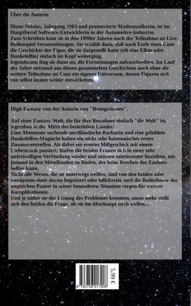 Auf einer Fantasy-Welt, die für ihre Bewohner einfach "die Welt" ist, irgendwo in der Mitte des besiedelten Landes:Eine Abenteuer suchende nordländische Barbarin und eine gebildete Dunkelelfen-Magierin haben ein nicht sehr harmonisches erstes Zusammentreffen. Als dabei ein ernstes Mißgeschick mit einem Liebestrank passiert, finden die beiden Frauen sich in einer sehr unfreiwilligen Verbindung wieder und müssen miteinander losziehen, um jemand in den Mittellanden zu finden, der beim Brechen des Zaubers helfen kann.Nicht alle Wesen, die sie unterwegs treffen, sind von den beiden oder wenigstens einer davon begeistert oder hilfsbereit, und die Bedürfnisse des ungleichen Paares in seiner besonderen Situation sorgen für weitere Komplikationen.Und je näher sie der Lösung des Problemes kommen, umso mehr stellt sich den beiden die Frage, ob sie die überhaupt noch wollen...