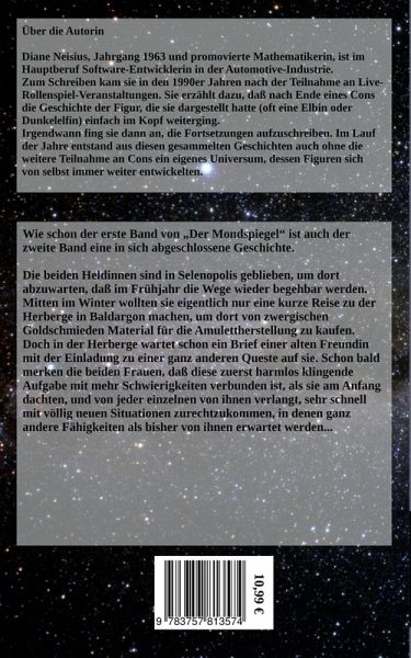 Wie schon der erste Band von "Der Mondspiegel" ist auch der zweite Band eine in sich abgeschlossene Geschichte.Die beiden Heldinnen sind in Selenopolis geblieben, um dort abzuwarten, daß im Frühjahr die Wege wieder begehbar werden. Mitten im Winter wollten sie eigentlich nur eine kurze Reise zu der Herberge in Baldargon machen, um dort von zwergischen Goldschmieden Material für die Amulettherstellung zu kaufen. Doch in der Herberge wartet schon ein Brief einer alten Freundin mit der Einladung zu einer ganz anderen Queste auf sie. Schon bald merken die beiden Frauen, daß diese zuerst harmlos klingende Aufgabe mit mehr Schwierigkeiten verbunden ist, als sie am Anfang dachten, und von jeder einzelnen von ihnen verlangt, sehr schnell mit völlig neuen Situationen zurechtzukommen, in denen ganz andere Fähigkeiten als bisher von ihnen erwartet werden...