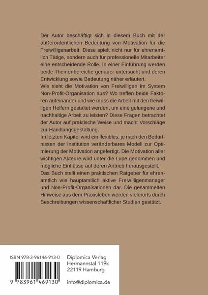 Der Autor beschäftigt sich in diesem Buch mit der außerordentlichen Bedeutung von Motivation für die Freiwilligenarbeit. Diese spielt nicht nur für ehrenamtlich Tätige, sondern auch für professionelle Mitarbeiter eine entscheidende Rolle. In einer Einführung werden beide Themenbereiche genauer untersucht und deren Entwicklung sowie Bedeutung näher erläutert. Wie sieht die Motivation von Freiwilligen im System Non-Profit-Organisation aus? Wo treffen beide Faktoren aufeinander und wie muss die Arbeit mit den freiwilligen Helfern gestaltet werden, um eine gelungene und nachhaltige Arbeit zu leisten? Diese Fragen betrachtet der Autor auf praktische Weise und macht Vorschläge zur Handlungsgestaltung.Im letzten Kapitel wird ein flexibles, je nach den Bedürfnissen der Institution veränderbares Modell zur Optimierung der Motivation angefertigt. Die Motivation aller wichtigen Akteure wird unter die Lupe genommen und mögliche Einflüsse auf deren Antrieb herausgestellt.Das Buch stellt einenpraktischen Ratgeber für ehrenamtlich wie hauptamtlich aktive Freiwilligenmanager und Non-Profit-Organisationen dar. Die gesammelten Hinweise aus dem Praxisleben werden vielerorts durch Beschreibungen wissenschaftlicher Studien gestützt.