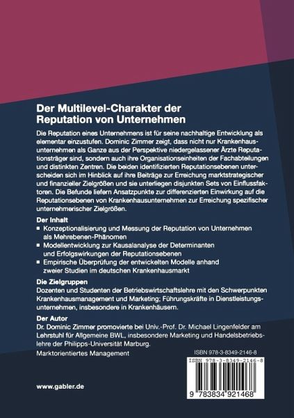 Die Reputation eines Unternehmens ist für seine nachhaltige Entwicklung als elementar einzustufen. Dominic Zimmer zeigt, dass nicht nur Krankenhausunternehmen als Ganze aus der Perspektive niedergelassener Ärzte Reputationsträger sind, sondern auch ihre Organisationseinheiten der Fachabteilungen und distinkten Zentren. Die beiden identifizierten Reputationsebenen unterscheiden sich im Hinblick auf ihre Beiträge zur Erreichung marktstrategischer und finanzieller Zielgrößen und sie unterliegen disjunkten Sets von Einflussfaktoren. Die Befunde liefern Ansatzpunkte zur differenzierten Einwirkung auf die Reputationsebenen von Krankenhausunternehmen zur Erreichung spezifischer unternehmerischer Zielgrößen.